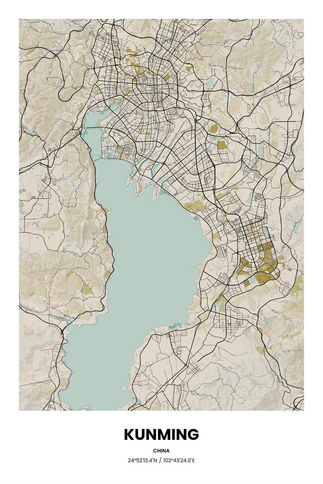 TITIMAP 专注销售城市地图系列装饰画,全球城市均可定制,昆明有着独特魅力。昆明有滇池、石林等美景,融入装饰画后尽显春城的温婉。
